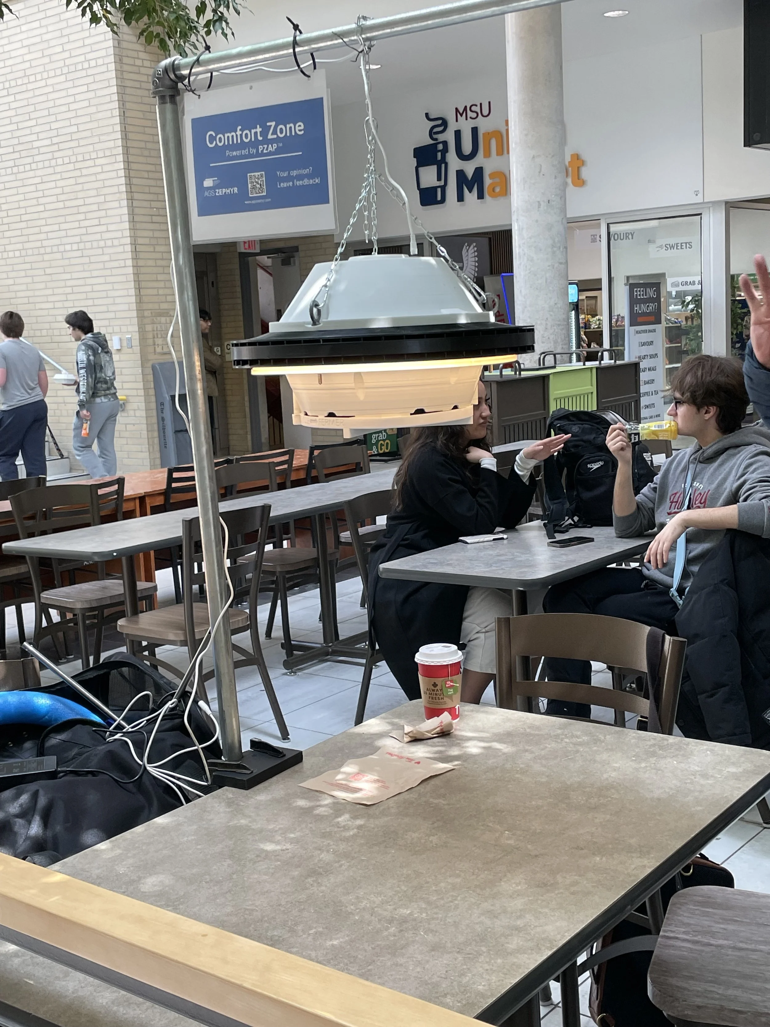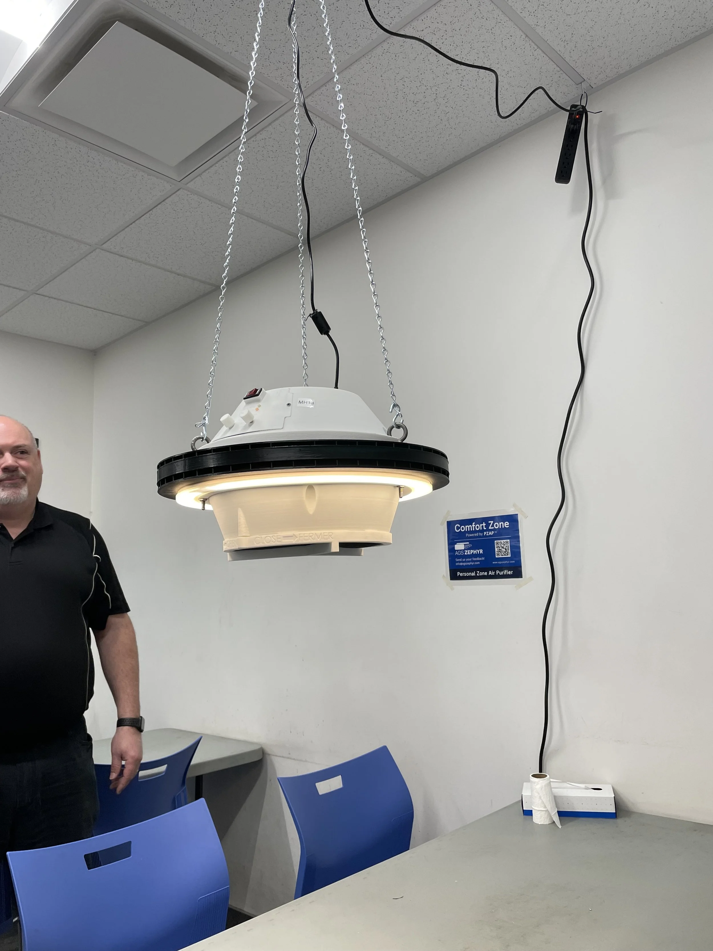 A PZAP was hung from the suspended ceiling over a table in the cafeteria.