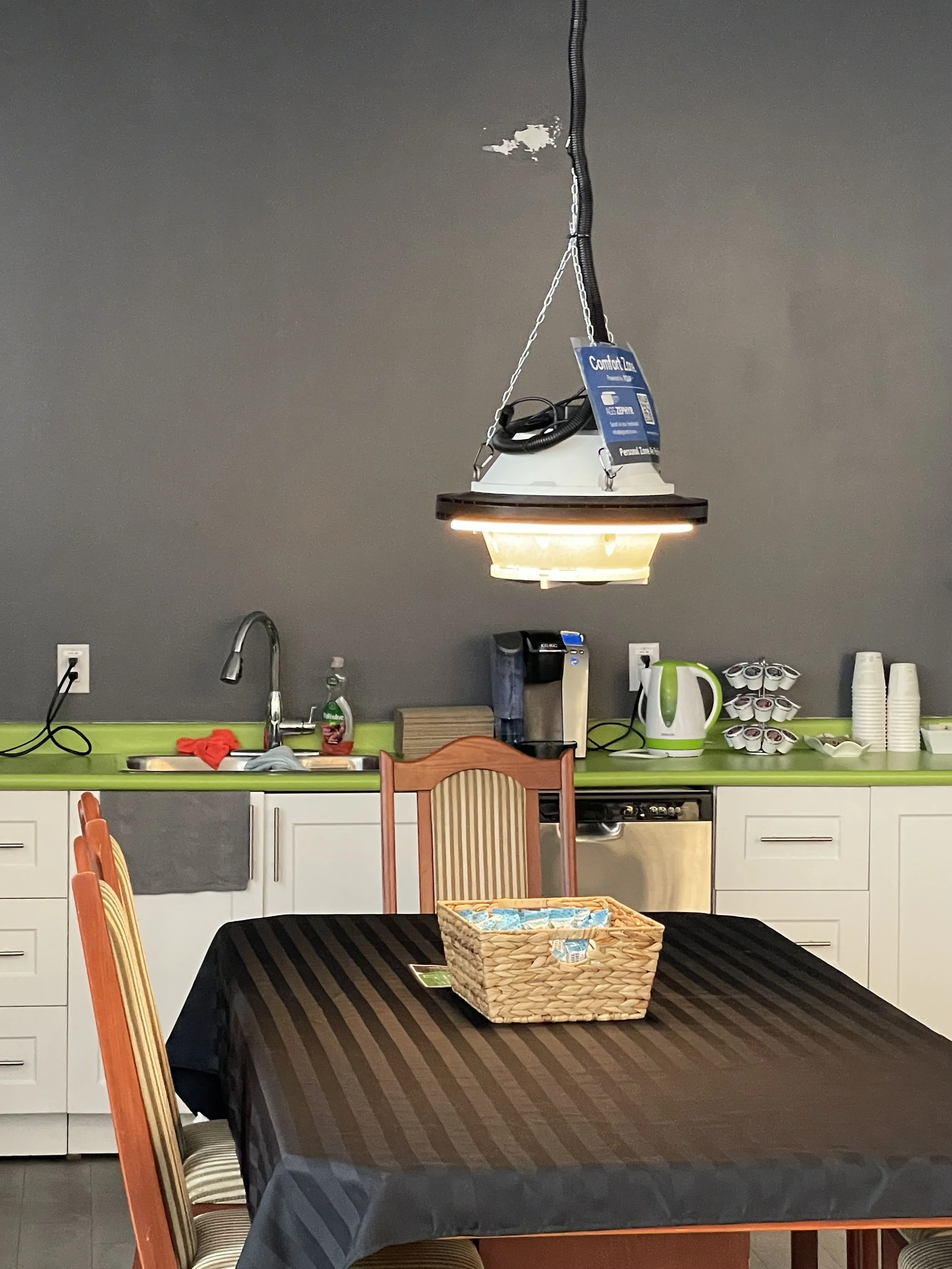 A PZAP was hung from a suspended ceiling over a table in the factory cafeteria.