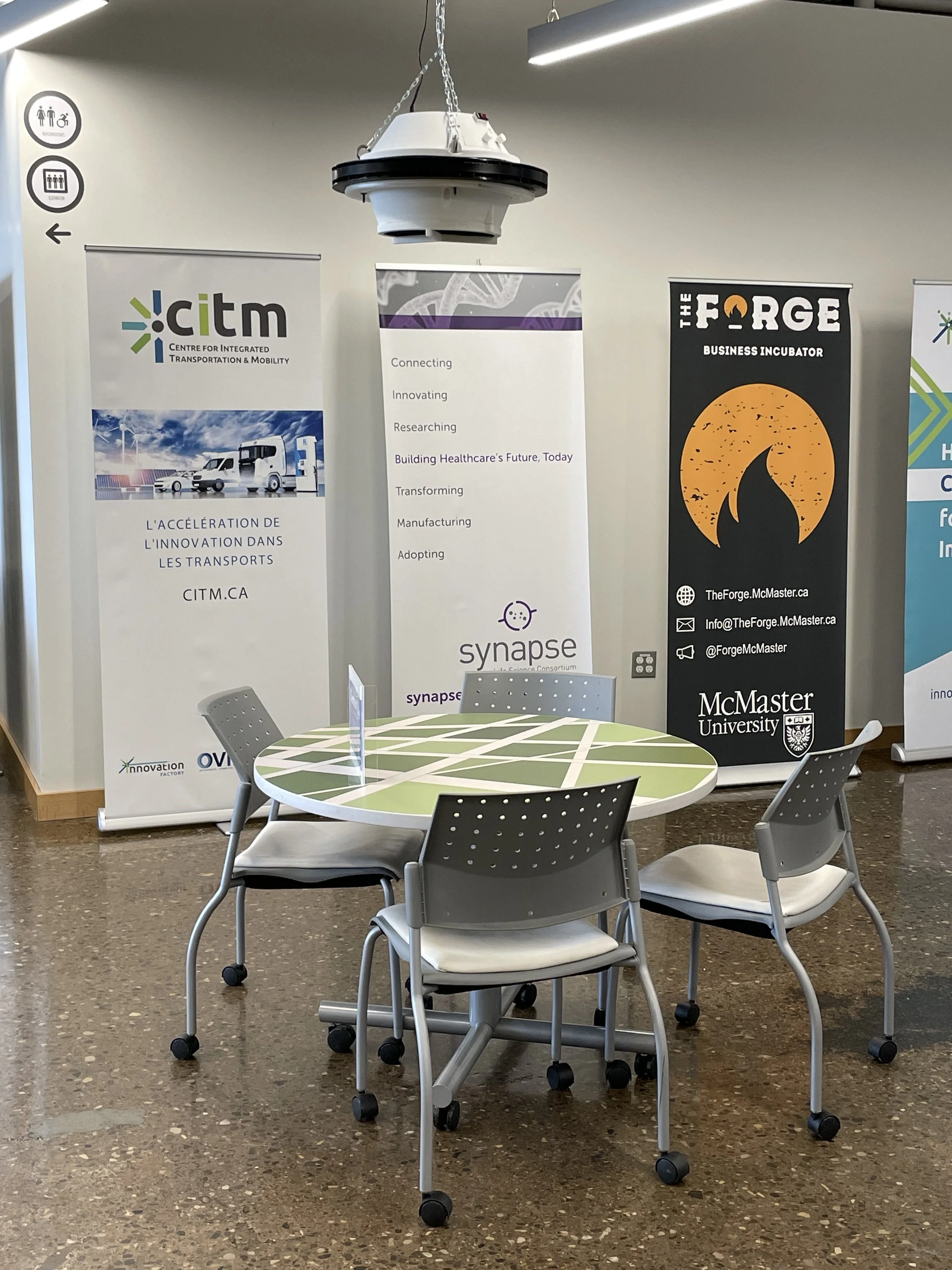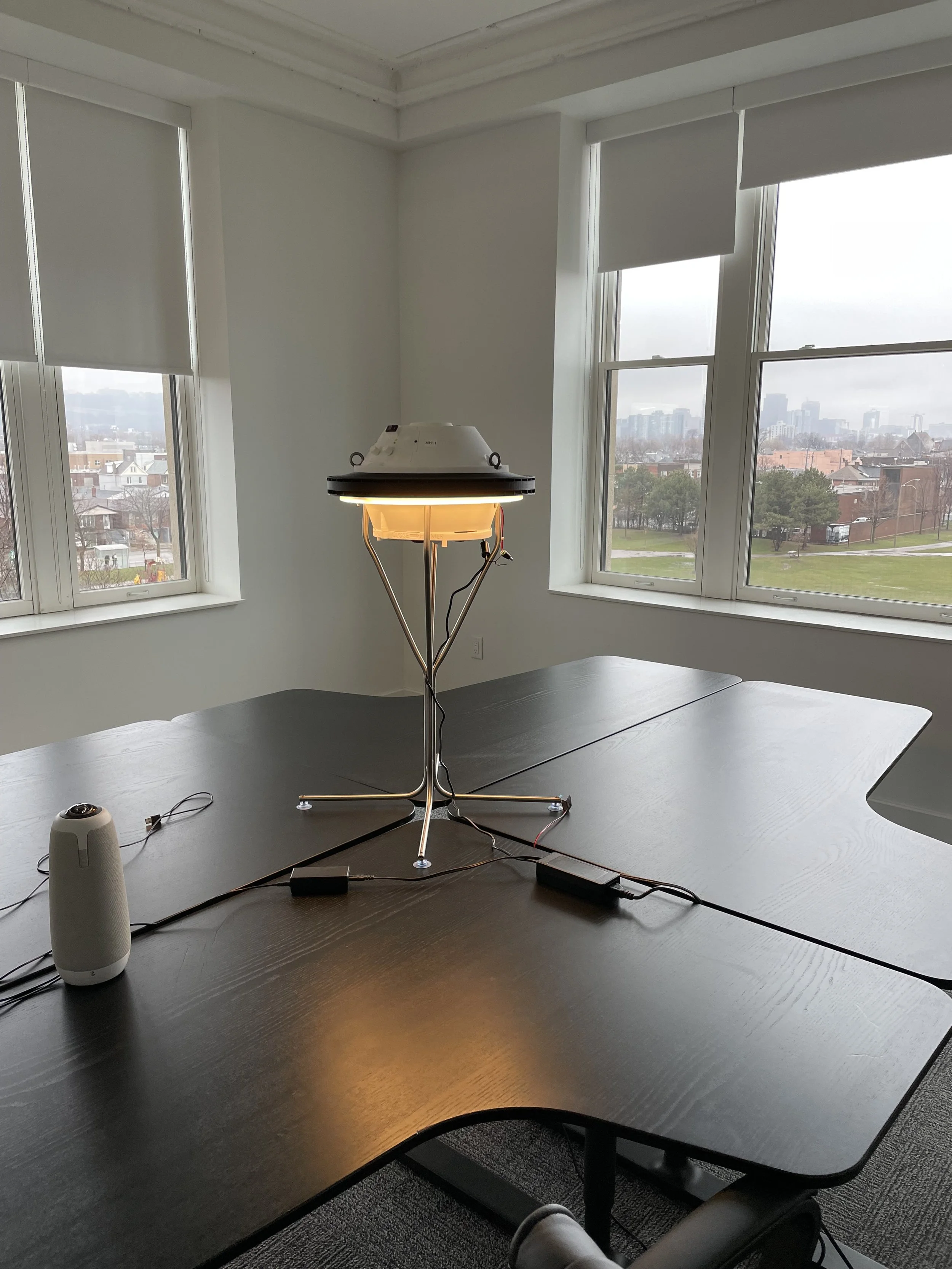 A special stand was affixed to the table to hang a PZAP due to the inpracticality of hanging it from the ceiling in a temporary manner.